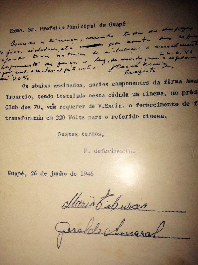 LEIA! Amarelou! Da moda,né? 70 anos guardaaado!!! Foi escrito em ''26 de junho de 1946'', o requerimento de ''Mário Tibúrcio e Geraldo Amaral'', pe-din-do ao pre-fei-to o direito de ter luz elétrica para fucionamento da máquina, para o antes, o durante, o depois e para o alto falante.Lê-se no requerimento,''vem requerer de V.Excia o fornecimento da FORÇA transformada em 220 Wolts...''Não sei ao certo por qto tempo esperaram.