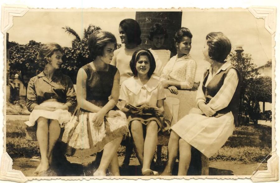 PENTEADOS como dessas moças da foto era a febre do momento, usava-se o cabelo curto, desfiado, penteado para trás e firmado com laquê, um spray possante que endurecia os fios e não saía um do lugar, nem se ventasse forte.A saia levantava com o vento, mas o cabelo,não.Havia penteado para cabelos longos, vários tipos de coques, as unhas muito bem feitas, maquiagem, e por aí vai.