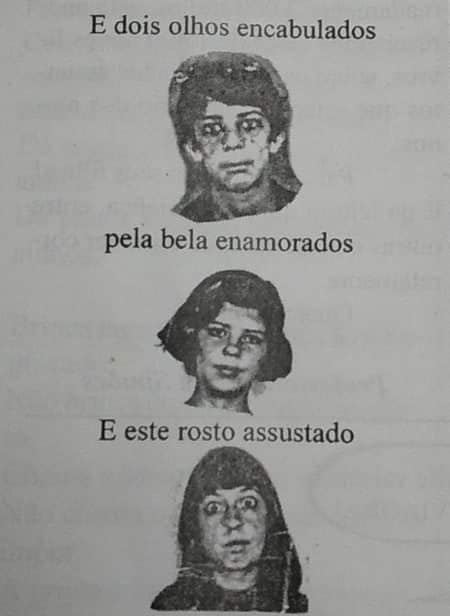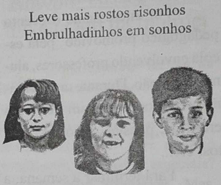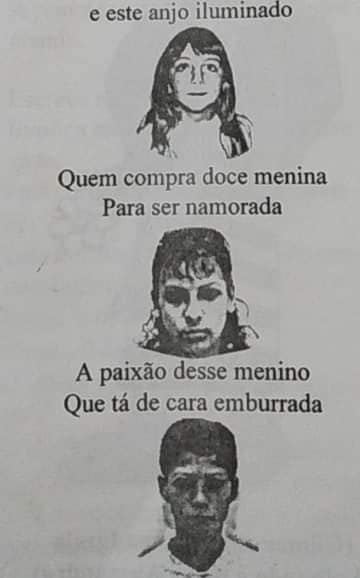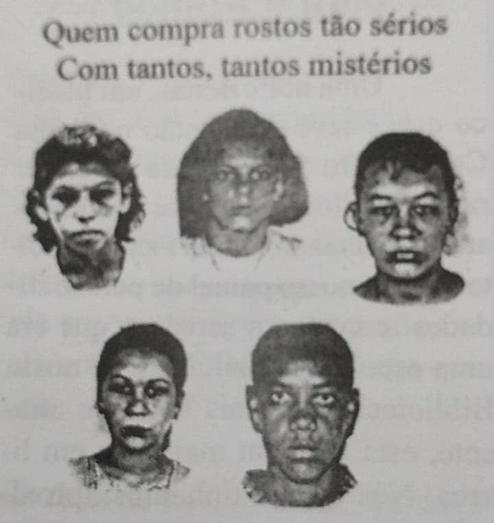 Quem compra rostos tão sérios,com tantos,tantos mistérios? E dois olhos encabulados pela bela enamorados? E este rosto assustado? E este anjo iluminado? Quem compra doce menina para ser namorada A paixão deste menino que tá de cara emburrada? Leve mais rostos risonhos embrulhadinhos em sonhos! Quem compra a vaidade explodindo nesta idade? Três faces só de ternura,outras três só de doçura?
